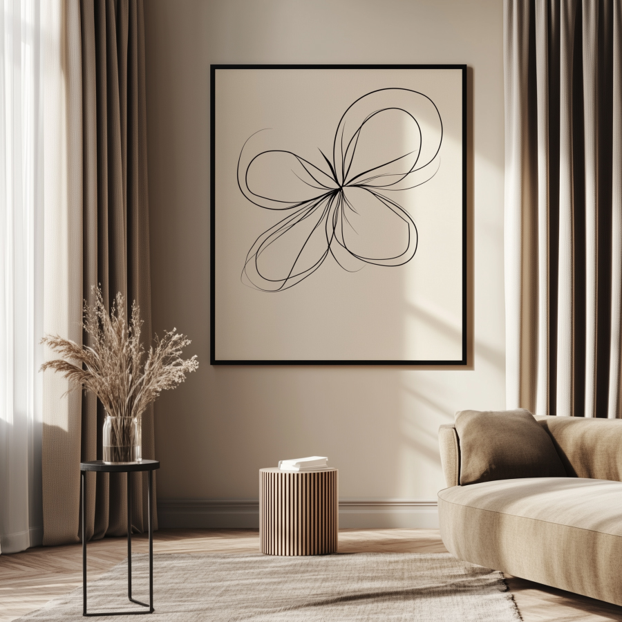 קנבס מינימליסטי עם קו אחד זורם היוצר צורה אורגנית ועדינה, כמעט מדיטטיבית. הרישום השחור על רקע בהיר